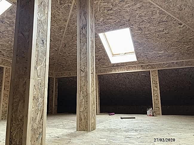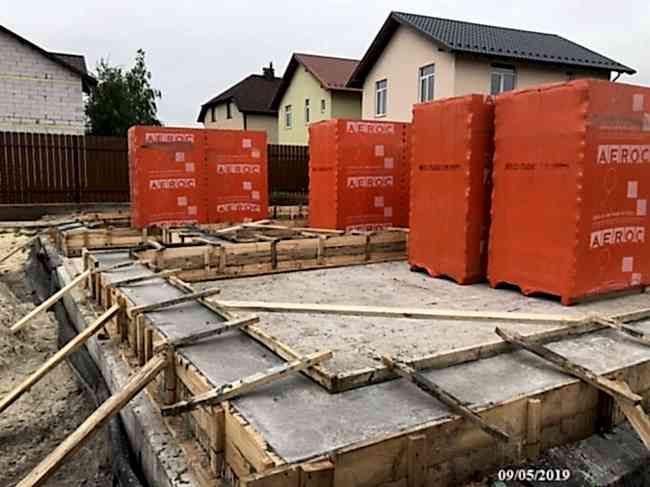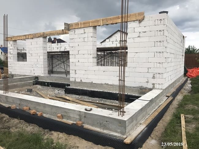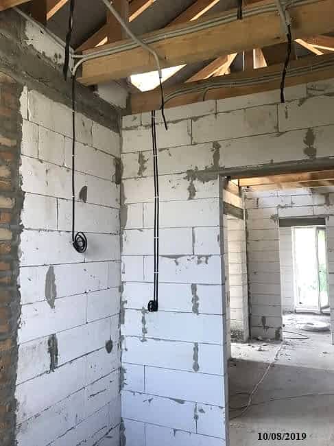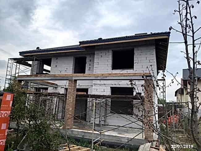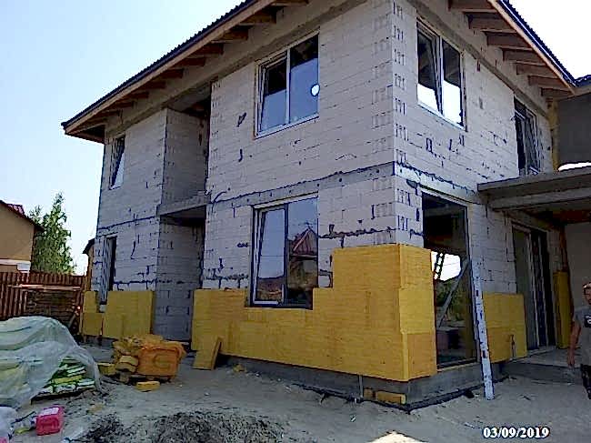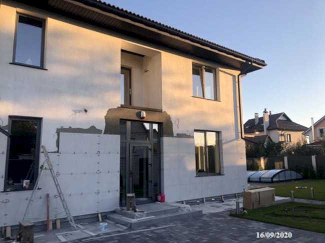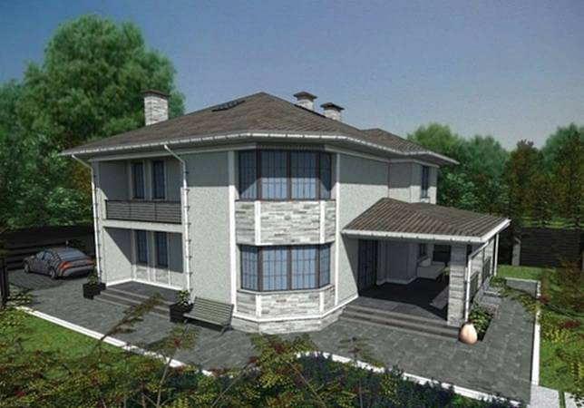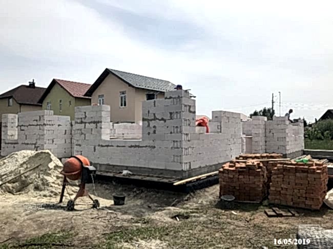 Стены выполнены из керамического блока Porotherm 440 мм, минеральная вата, декоративная покраска, перекрытие сборное, кровля - битумная черепица, фасадное Пин Ап